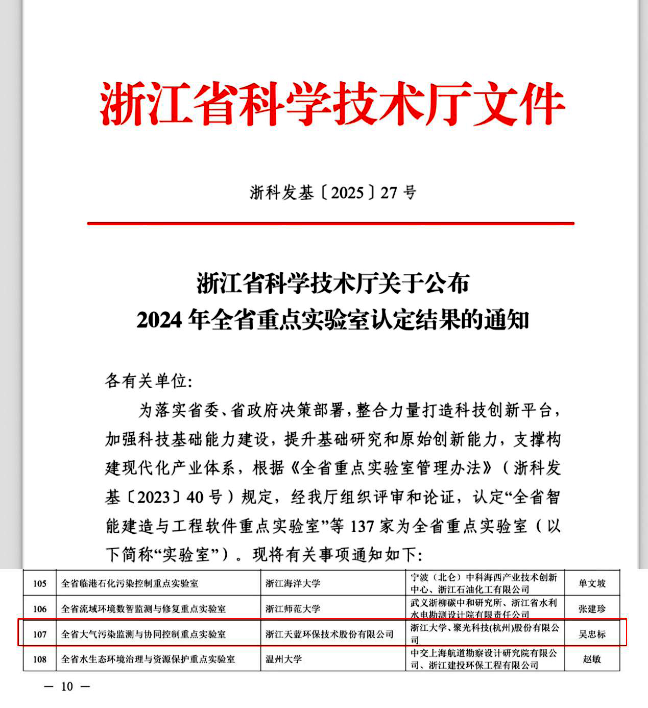 2025年6月4日,浙江省科技廳發(fā)布《浙江省科學(xué)技術(shù)廳關(guān)于公布2024 年全省重點(diǎn)實(shí)驗(yàn)室認(rèn)定結(jié)果的通知(浙科發(fā)基〔2025〕27號(hào))》,由浙江天藍(lán)環(huán)保技術(shù)股份有限公司牽頭,浙江大學(xué)和聚光科技(杭州)股份有限公司共建的“全省大氣污染監(jiān)測(cè)與協(xié)同控制重點(diǎn)實(shí)驗(yàn)室”獲批組建,成為全省環(huán)境領(lǐng)域唯一以企業(yè)牽頭建設(shè)的省級(jí)重點(diǎn)實(shí)驗(yàn)室。